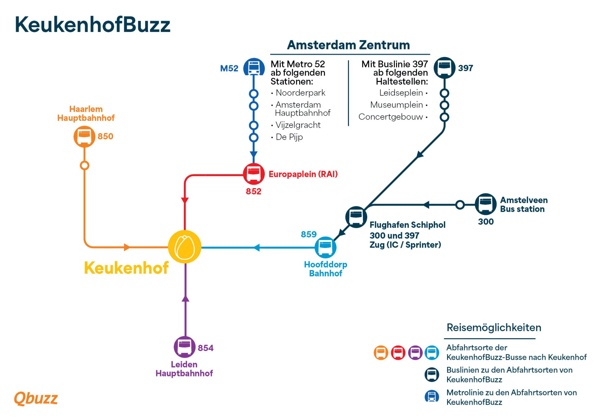 Am Bahnhof Hoofddorp steigen Sie am Busbahnhof in den KeukenhofBuzz-Bus der Linie 859 um. Dieser Bus fährt viermal pro Stunde und bringt Sie in etwa 25 Minuten ohne Zwischenstopps zum Haupteingang des Keukenhofs.